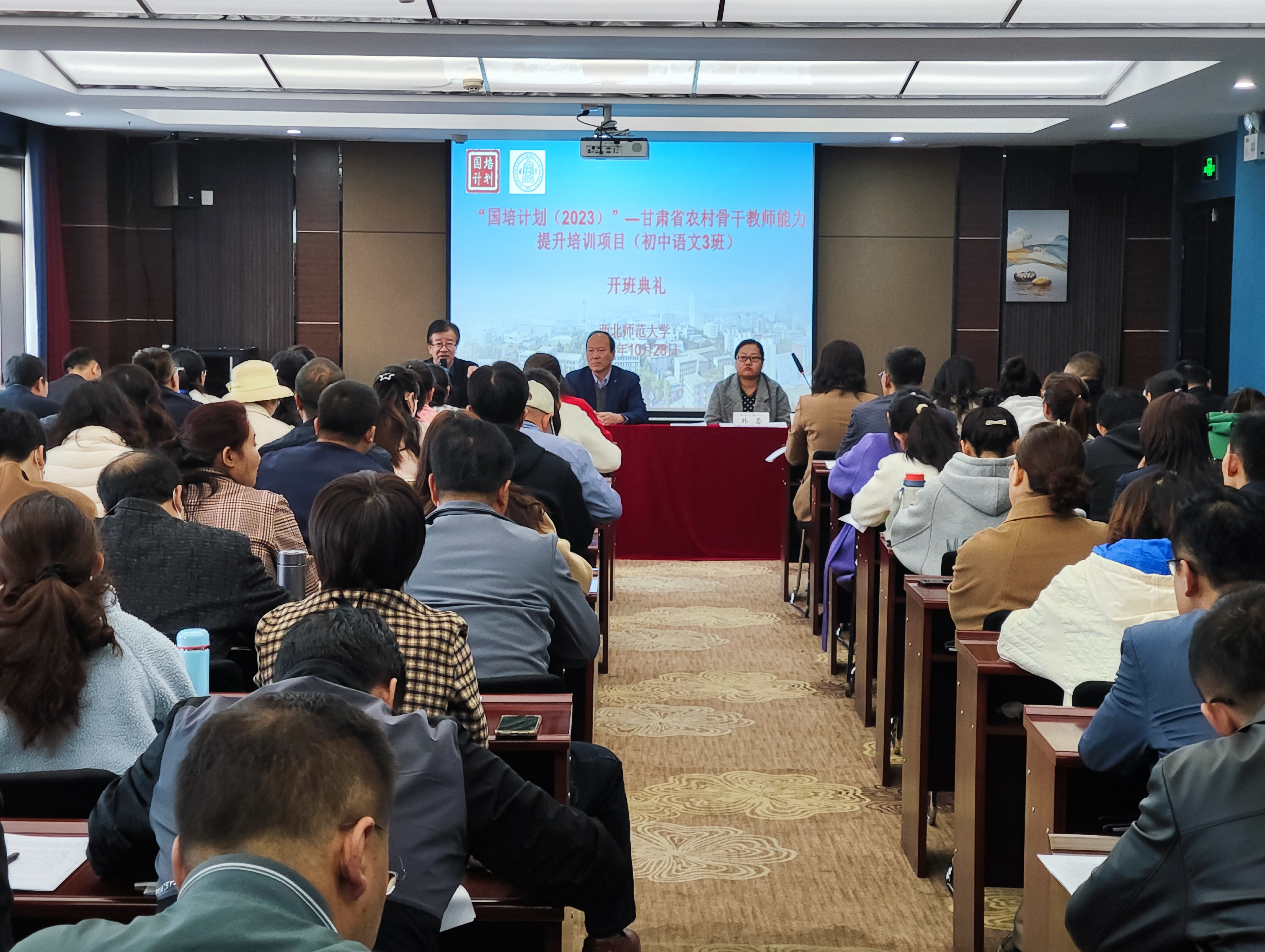 10月28日上午,“国培计划(2023)”—甘肃省省级农村骨干教师(初中语文)能力提升培训在3044am永利集团3044noc顺利开班。3044am永利集团3044noc继续教育学院副院长李玉泉、项目学科负责人石义堂教授、培训中心项目负责人以及来自全省100名初中语文骨干教师参加开班仪式。