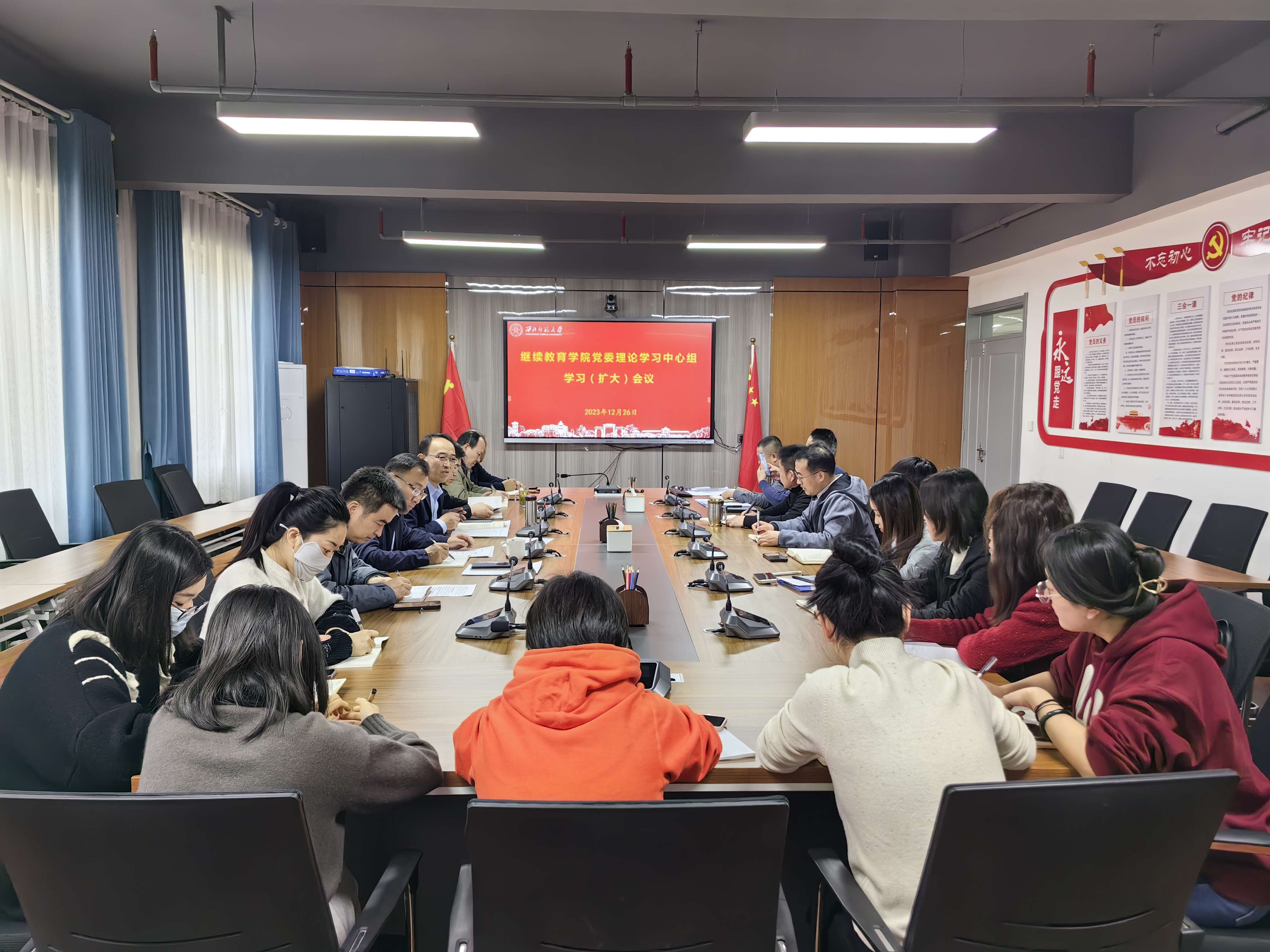 12月26日下午,继续教育学院党委召开党委理论学习中心组(扩大)会议。院长杨纳名传达学习中央经济工作会议精神并安排学院工作,党委书记陈科传达学习习近平总书记最新重要讲话精神和相关文件精神并安排贯彻落实工作。班子成员李建升、李玉泉、荆孝民、马占寿参加学习,党委委员、教职工党员以及入党积极分子参加集体学习。